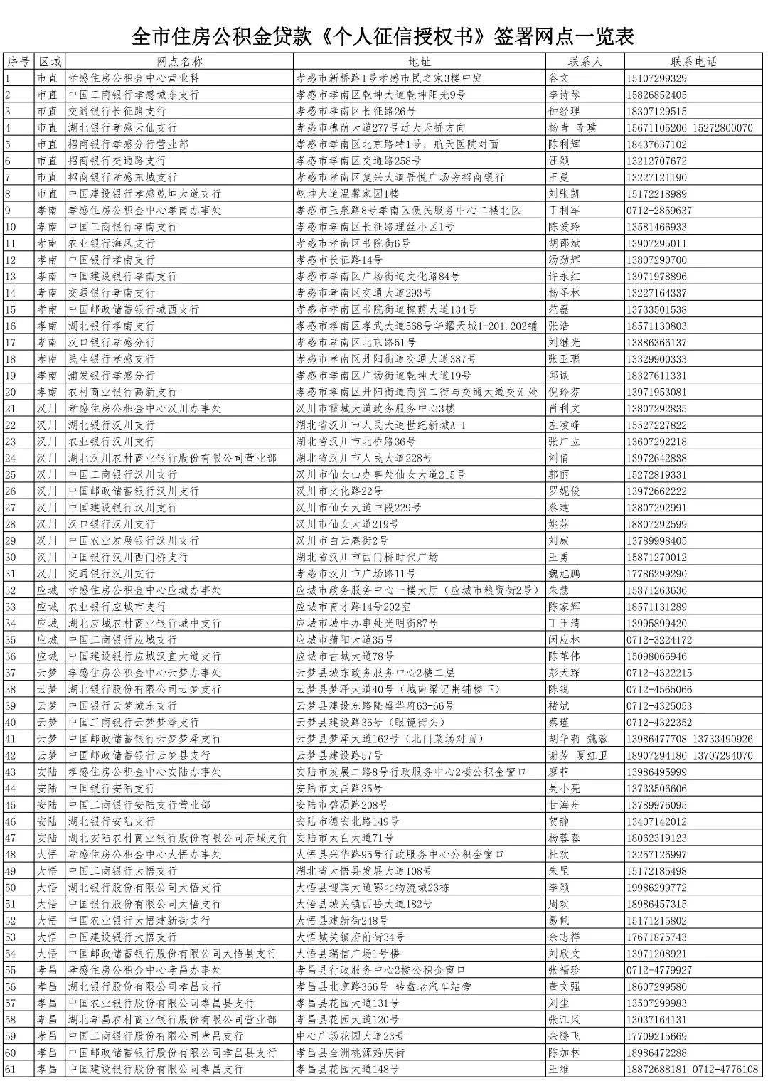 ? ? ? ?一、凡在孝感住房公積金中心辦理公積金貸款且未結(jié)清的職工,均需與我中心簽訂《個人征信授權(quán)書》。2023年6月30日前,請借款人、配偶、共同借款人及相關(guān)擔保人持本人身份證到全市就近的任一公積金營業(yè)網(wǎng)點或公積金委托銀行網(wǎng)點簽署《個人征信授權(quán)書》(各網(wǎng)點地址附后),逾期未簽署《個人征信授權(quán)書》,將會影響您的公積金有關(guān)業(yè)務。