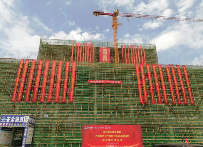 ? ? ? ?6月30日上午,由安居開(kāi)發(fā)建設(shè)集團(tuán)承建的湖北職業(yè)技術(shù)學(xué)院養(yǎng)老服務(wù)業(yè)產(chǎn)教融合實(shí)訓(xùn)基地項(xiàng)目實(shí)訓(xùn)樓主體結(jié)構(gòu)封頂。湖北職業(yè)技術(shù)學(xué)院相關(guān)領(lǐng)導(dǎo)、澴川國(guó)投相關(guān)班子成員出席封頂儀式,建設(shè)、勘察、設(shè)計(jì)、監(jiān)理、施工、勞務(wù)分包等單位負(fù)責(zé)人及施工人員共90余人參加封頂活動(dòng)。