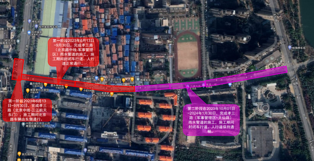 ? ? ? ?按照孝感城區(qū)北京路以東片區(qū)雨污分流綜合改造工程的施工安排,2023年6月5日至2024年2月10日對(duì)孝三路進(jìn)行雨污分流管道改造施工。