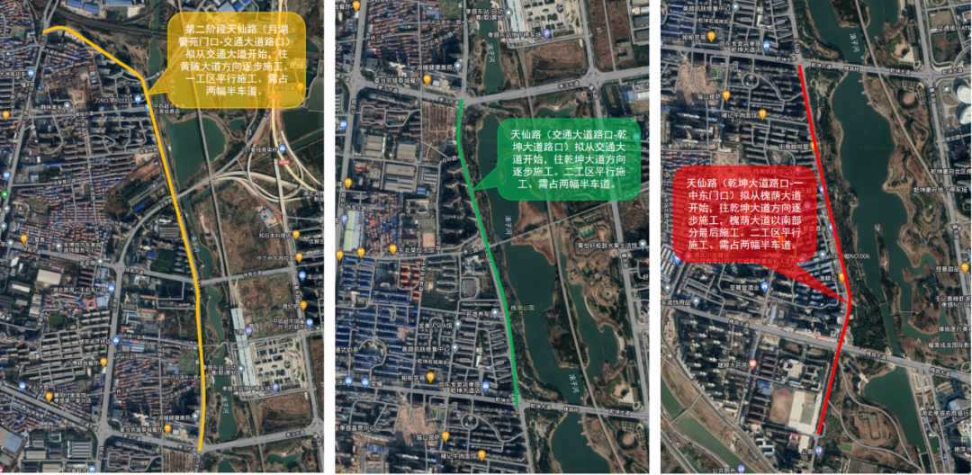 ? ? ? ?城區(qū)南部:城南大道施工期間,東西向交通分?jǐn)傊罶419、沿河南路及通過(guò)周邊路網(wǎng)轉(zhuǎn)換,預(yù)計(jì)次年11月完工;硚孝大道二期改造主要位于綠化帶及非機(jī)動(dòng)車道范圍,施工期間不影響主線車輛通行,預(yù)計(jì)次年11月完工;孝武大道采用半幅施工方式,施工期間周邊居民車輛可正常通行,南北向過(guò)境交通流可由硚孝大道分擔(dān),預(yù)計(jì)次年11月完工。