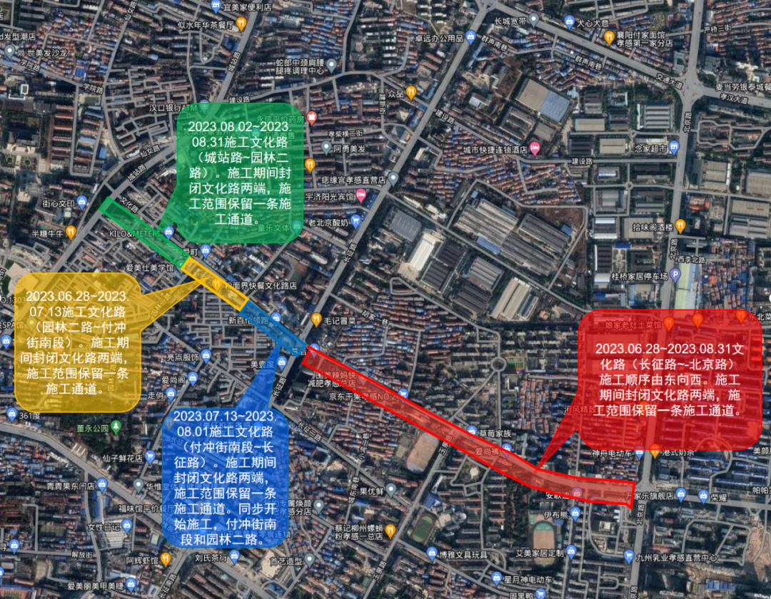 ? ? ? ?文化路(城站路~長(zhǎng)征路)為全封閉施工,施工期間不允許過(guò)境車輛通行。施工期間,車輛可由長(zhǎng)征一路、長(zhǎng)征二路、建設(shè)路等平行道路過(guò)境通行。