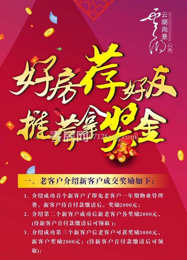 老帶新優(yōu)惠:1、老客戶介紹成功shou個(gè)新客戶即免老客戶一年物業(yè)管理費(fèi),新客戶獎(jiǎng)勵(lì)2000元;2、介紹二個(gè)新客戶成功后新老客戶各獎(jiǎng)勵(lì)2000元;3、介紹三個(gè)成功后老客戶獎(jiǎng)勵(lì)3000元,新客戶獎(jiǎng)勵(lì)2000元。(所有現(xiàn)金獎(jiǎng)勵(lì)待新客戶付款繳清后領(lǐng)?。?/span>