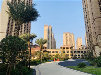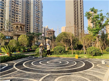 二期園林景觀工程現(xiàn)已基本完成,臨街行道香樟樹已種植完,商鋪石材貼磚正在施工。