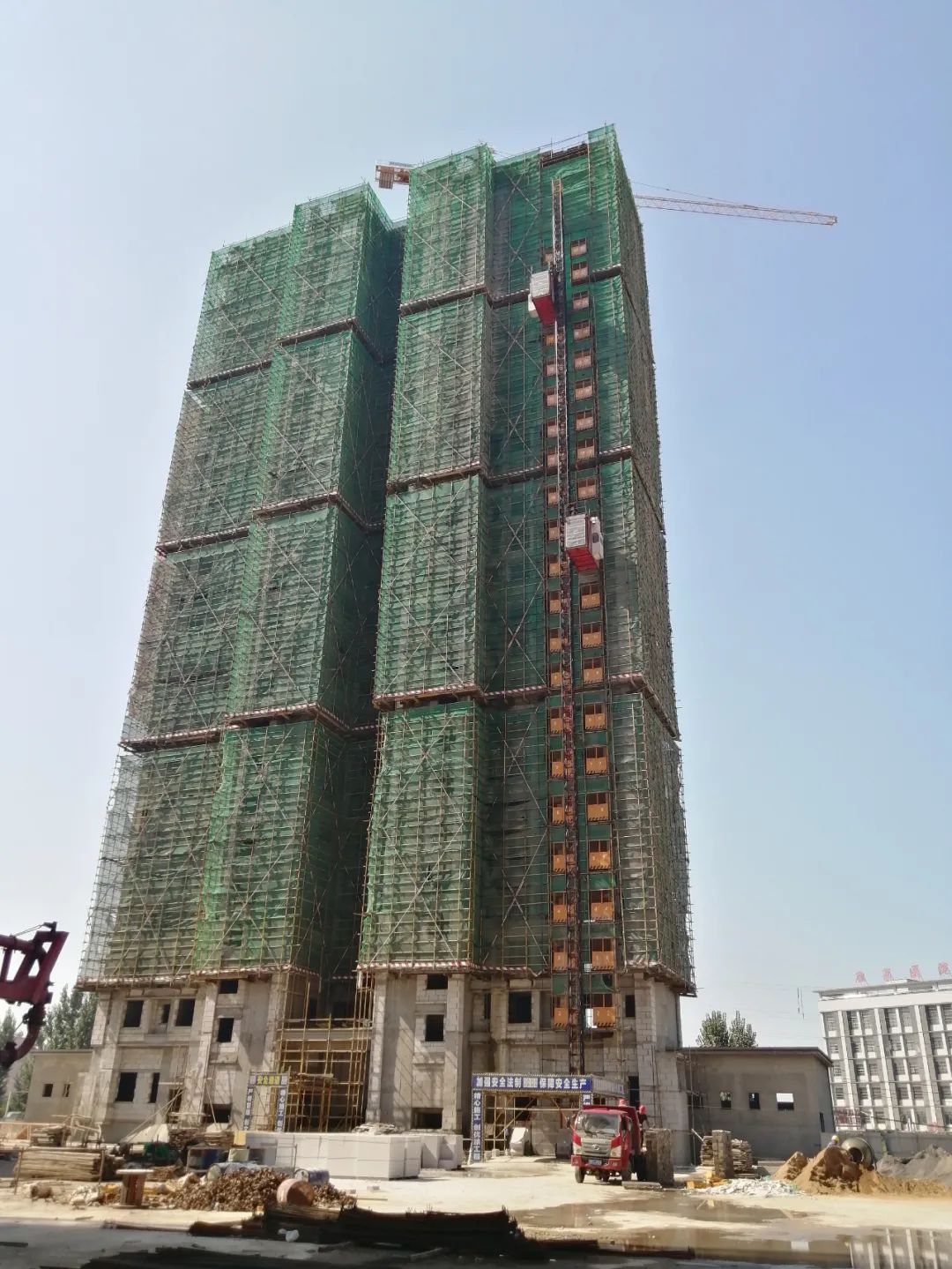 已封頂,外墻腳手架已部分拆除,下階段將進行外墻粉刷。