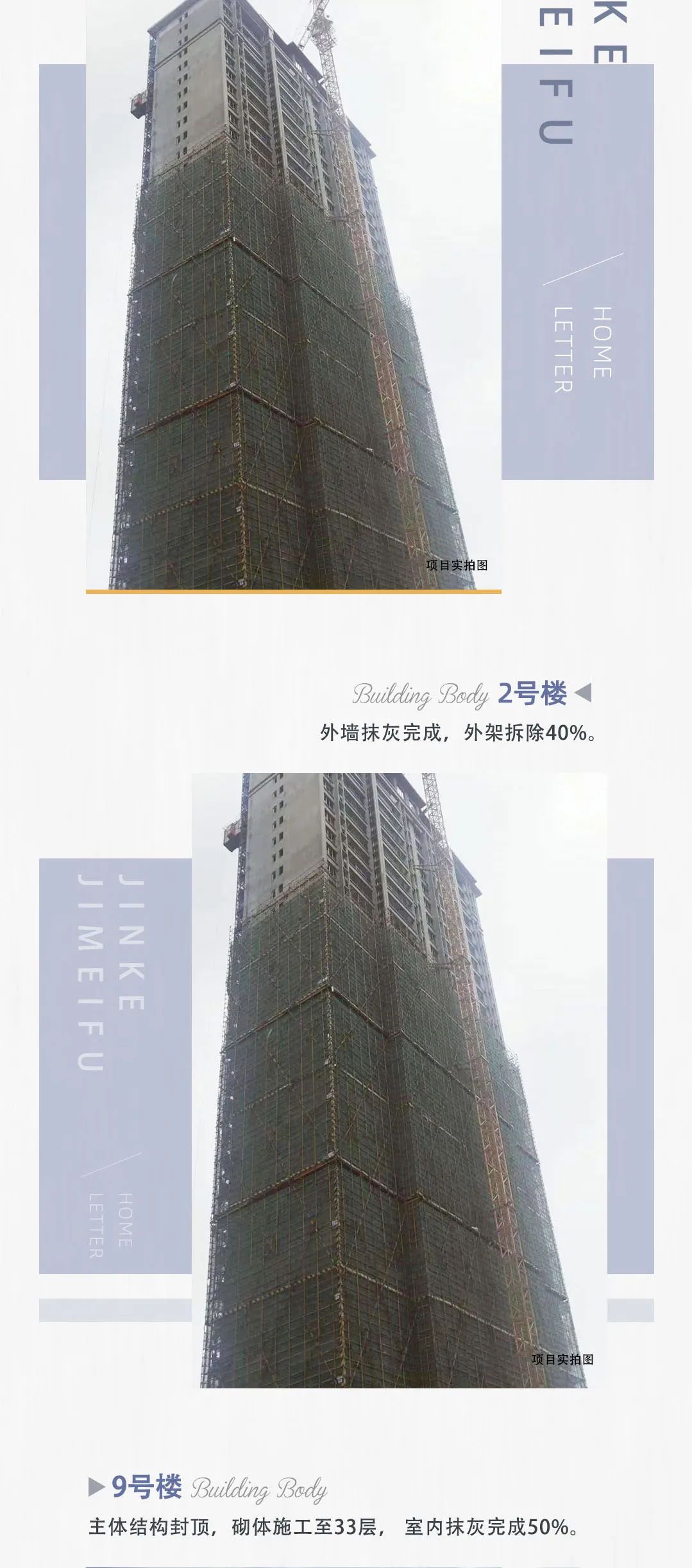 ? ? ? ?項目進度:1/2#樓正在拆除腳手架,9#樓砌體施工至33層