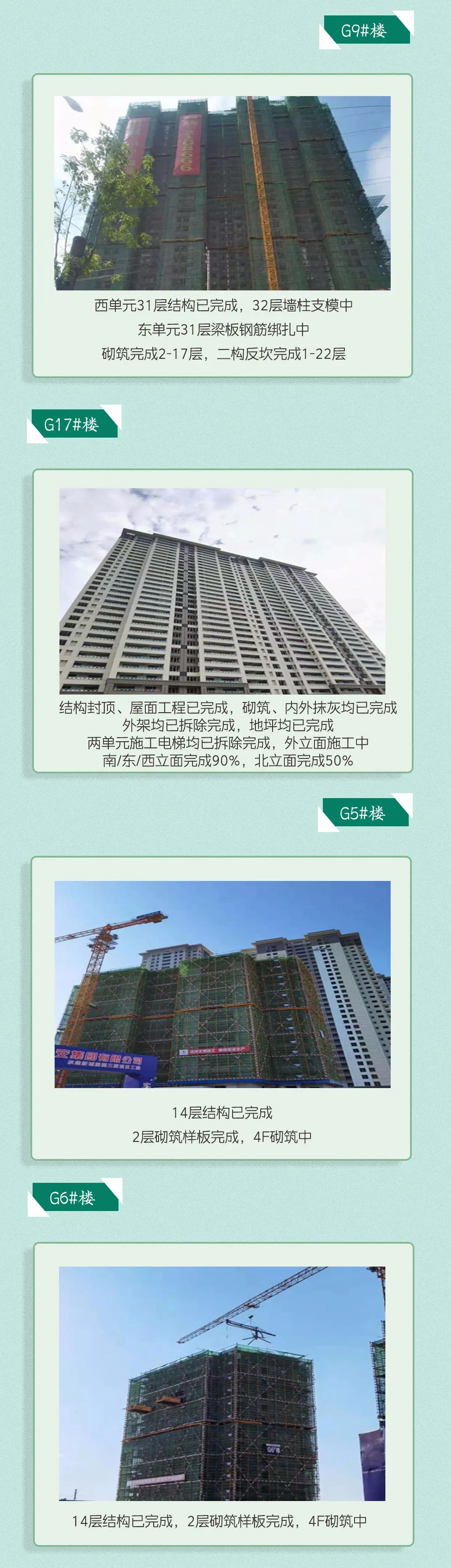? ? ? ?項目進(jìn)度:G1/G2#頂棚膩子批白完成50%,G3#外墻涂料完成70%,G4#外墻涂料完成20%,G9#砌筑完成2-17層,G17#北立面完成50%