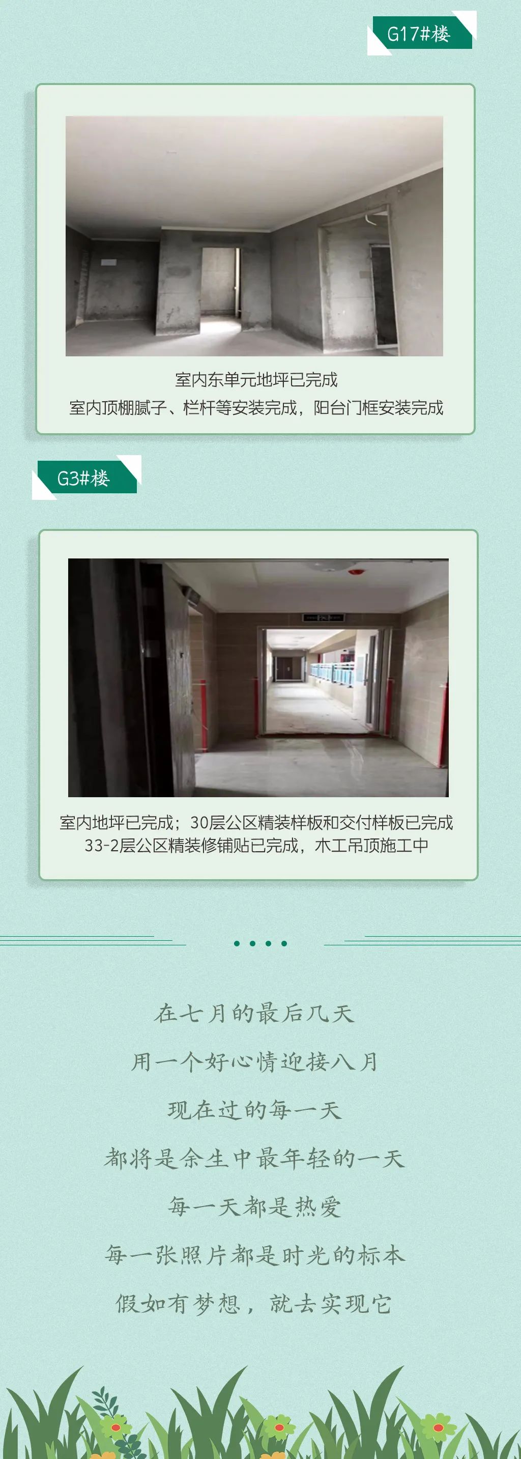 ? ? ? ?七月末尾,暑意正濃,幸福也在不斷加溫。值此美好的時節(jié),家音也如期而至??v然烈日當(dāng)空,辛勤的匠人們也依然堅守一線,以高標(biāo)準(zhǔn)的質(zhì)量,一磚一瓦,匠心獨(dú)運(yùn)的精工細(xì)筑,竭力將美好歸心生活,呈現(xiàn)給每一位家人。