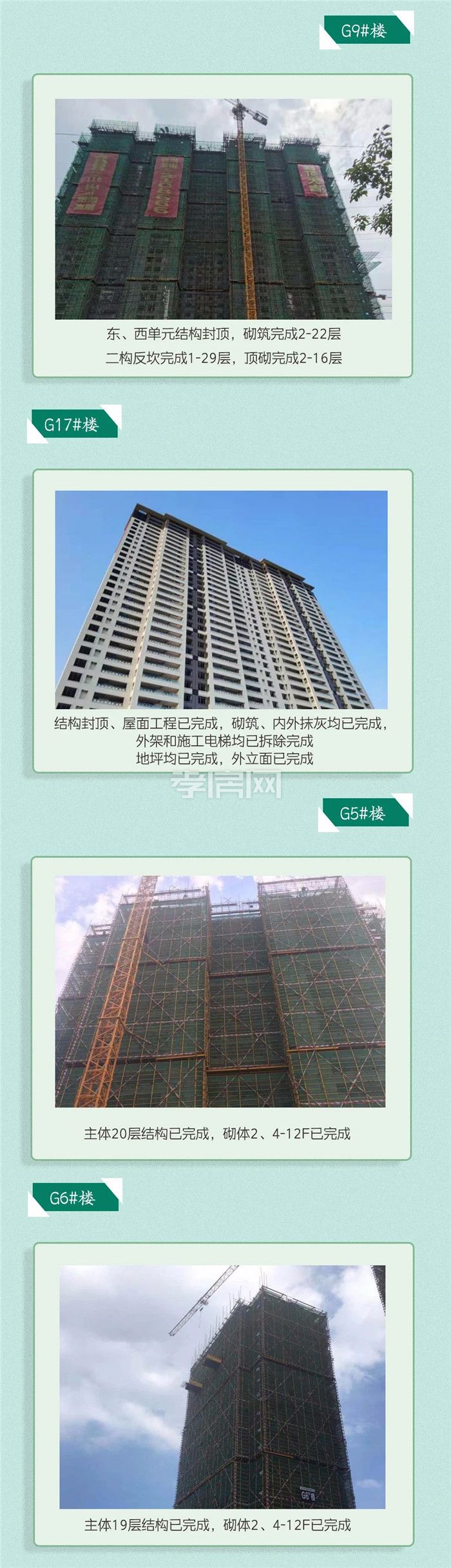 ? ? ? ?項(xiàng)目進(jìn)度:G1/G2/G3/G4#樓結(jié)構(gòu)封頂,公區(qū)精裝修完成百分之80左右,G9#樓已封頂,G17#樓外立面已建好,G5/G6#樓已建至20層,G7#樓已建至14層,G3#樓公區(qū)裝修中。