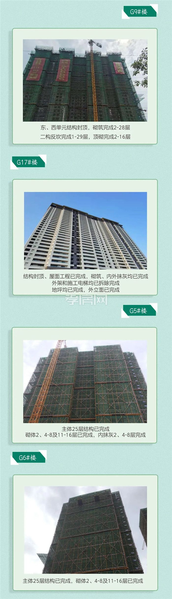 ? ? ? ?項(xiàng)目進(jìn)度:G1/G2/G3/G4/G17#樓外立面已建好,G9#樓正在建外立面,G5/G6#樓已建至25層,G7#樓已建至19層,G3#樓公區(qū)裝修基本完成。