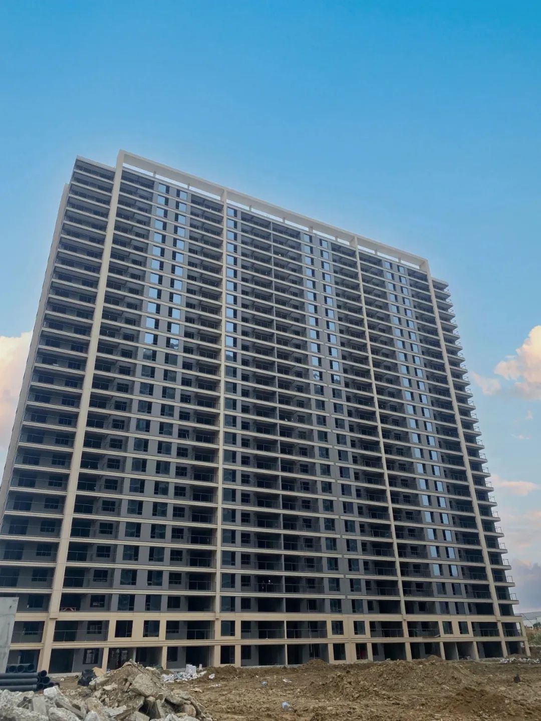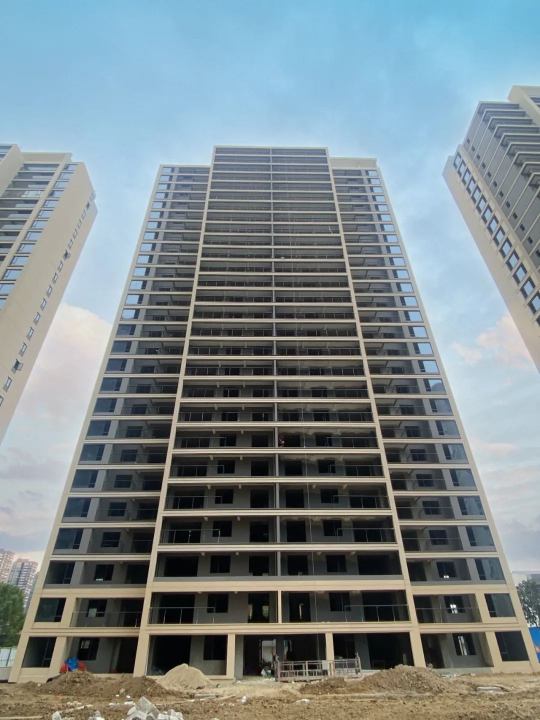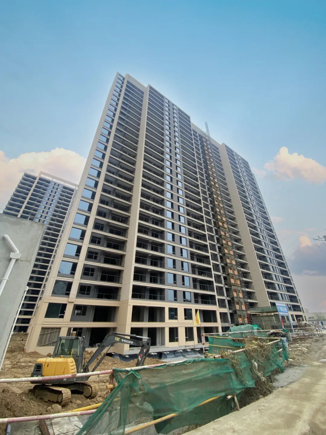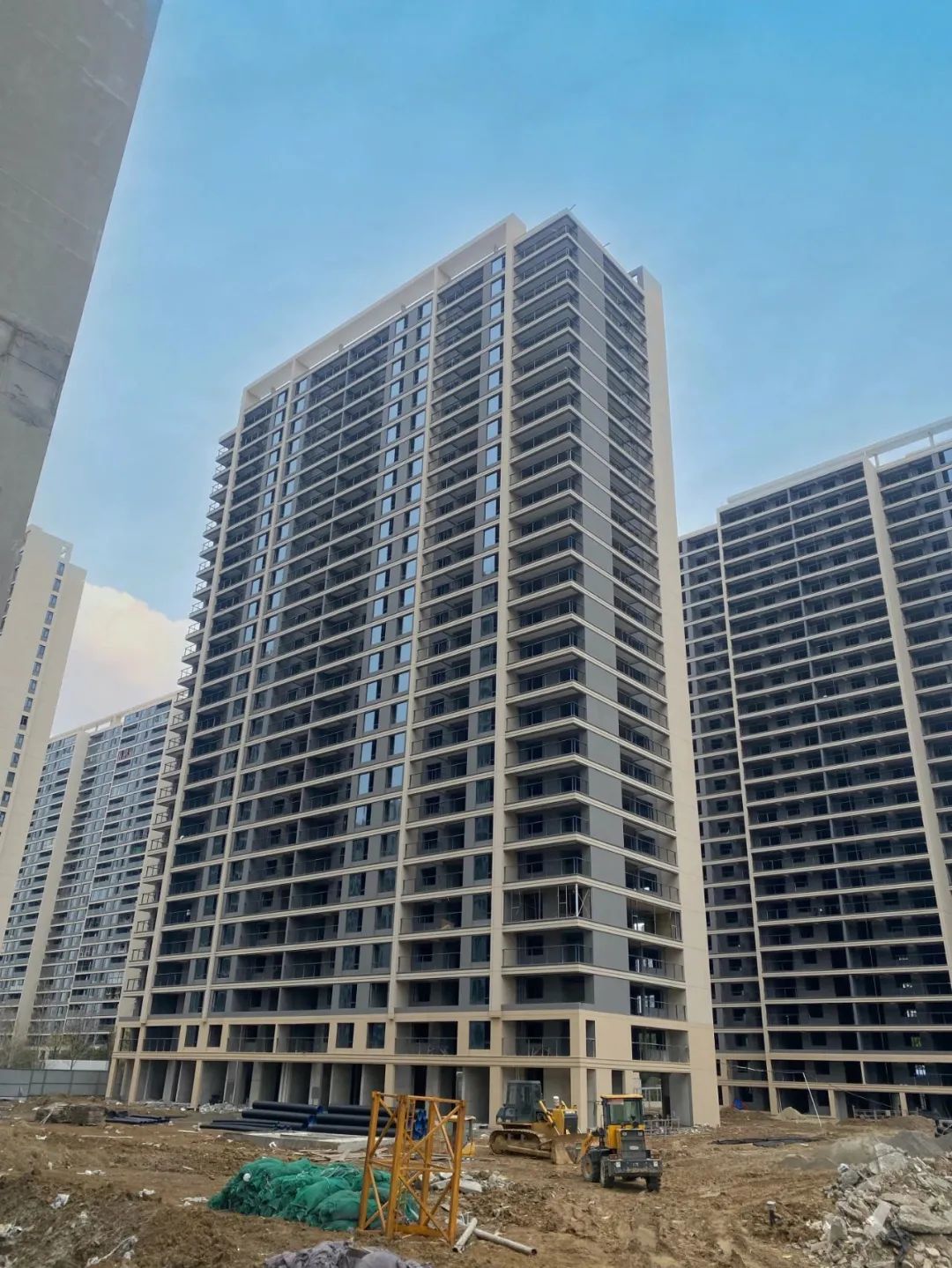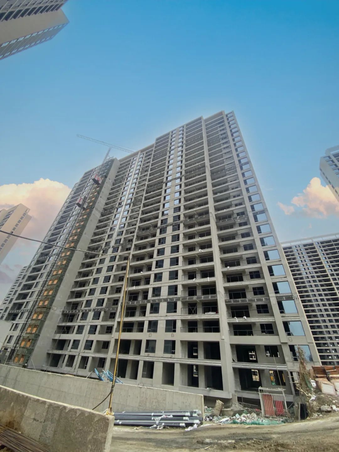 ? ? ? ? 12#主體結(jié)構已封頂,外立面施工完成,護欄及玻璃有序安裝中。