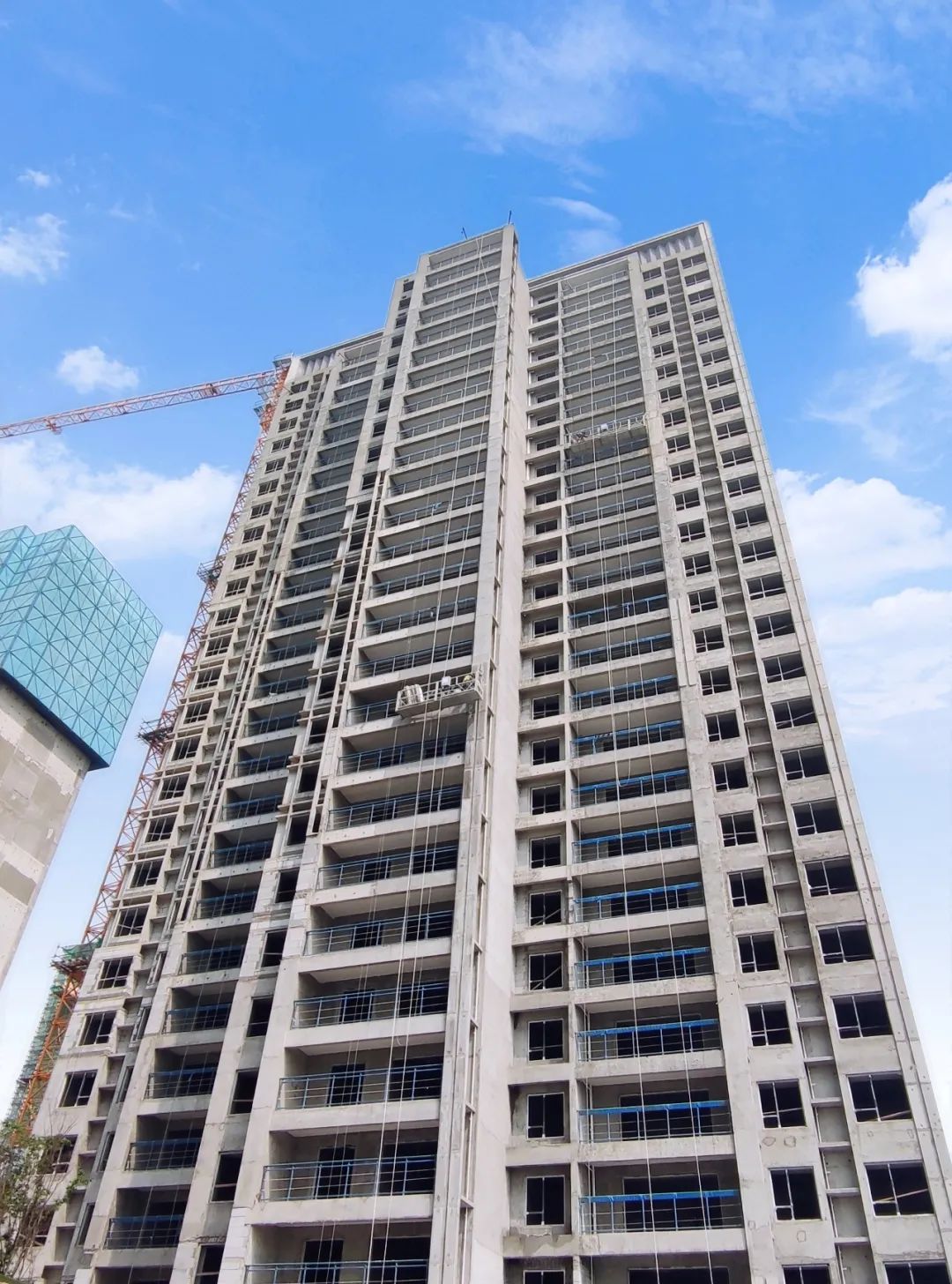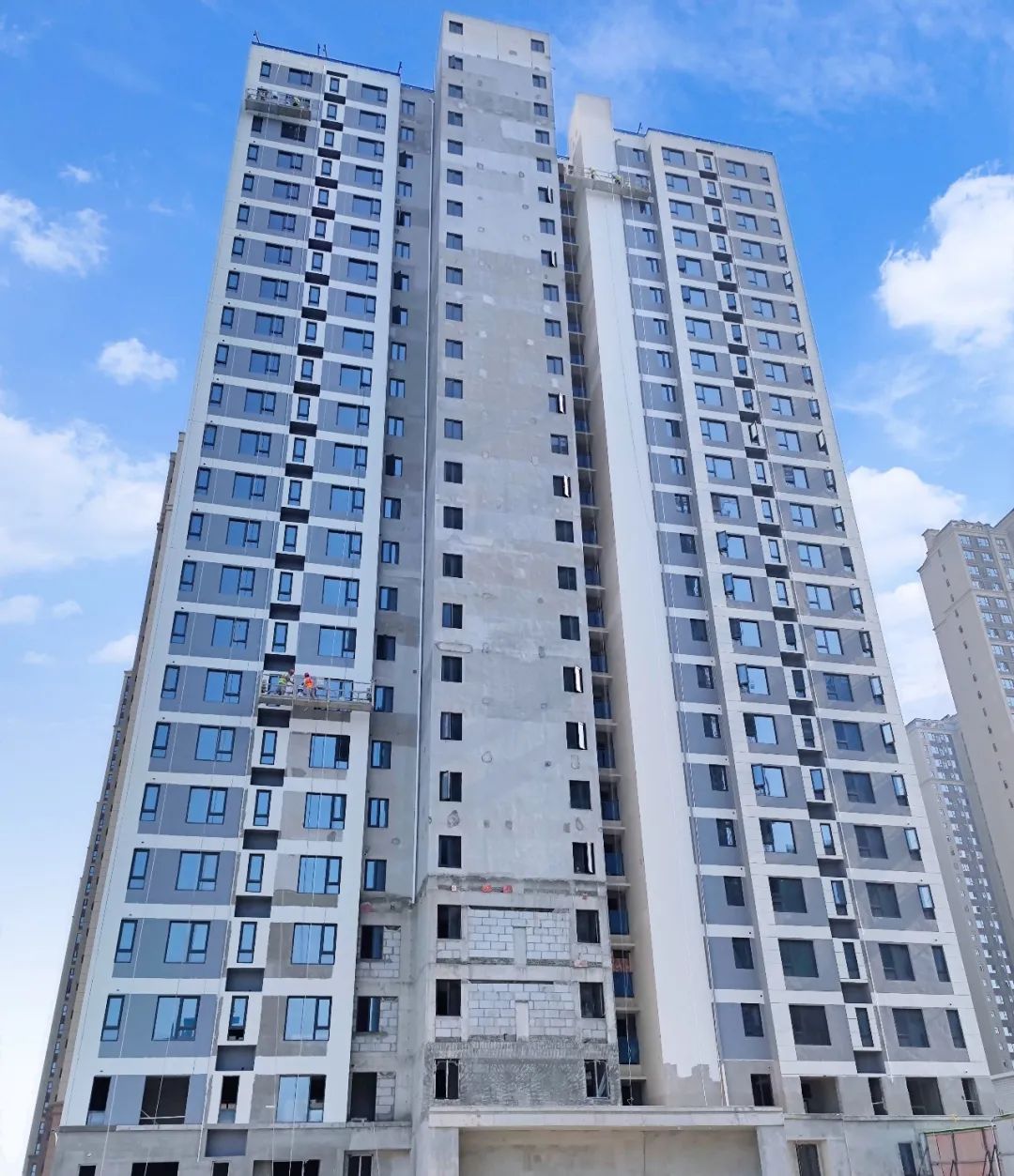 3#樓外墻吊籃抹灰收尾中,