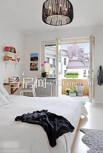 宜家小戶型樣板:從臥室門口看臥室&陽臺,黑色的藝術(shù)吊燈非常搶眼。