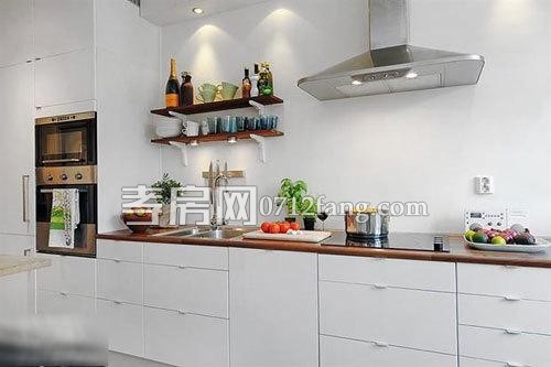 宜家小戶型樣板:木質(zhì)臺面,同材料的隔板,跟白色的櫥柜很相配。廚房區(qū)域功能劃分的很清楚。