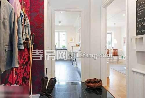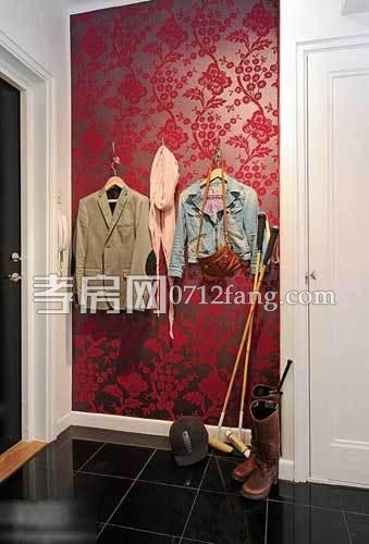 宜家小戶型樣板:進門的墻面上做了衣架,用花色的紫紅壁紙作為背景,添色了不少