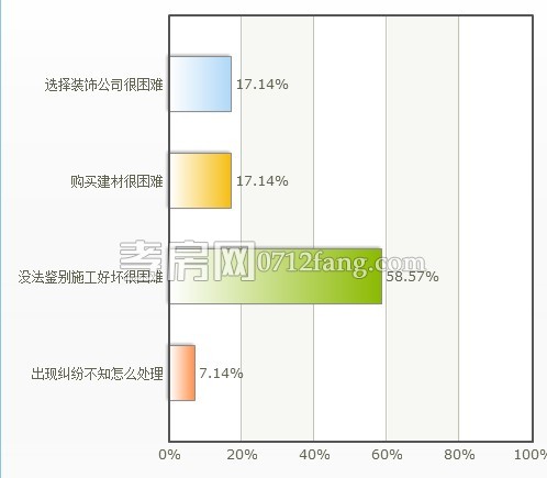 裝修困難的地方,58.57%的比例顯示“沒法鑒別施工好壞很困難”是網(wǎng)友們覺得困難的。其次表示選擇裝修公司很困難和購(gòu)買建材很困難的網(wǎng)友各占17.14%。結(jié)論:看來大多數(shù)的裝修奴都是裝修小白,對(duì)施工工藝不了解,自然也無法辨別和驗(yàn)證施工水平的好壞,您可以選擇簡(jiǎn)單快速的辦法是上孝房網(wǎng)免費(fèi)參加看工地學(xué)裝修活動(dòng),也可以上加入孝感業(yè)主裝修群,討教經(jīng)驗(yàn)。其次選裝飾公司和選材兩大攔路虎,這為裝飾公司提供了信號(hào),除了服務(wù)這種軟件要提升,裝修材料這種硬件也要同步跟進(jìn),才能抓住客戶的心。