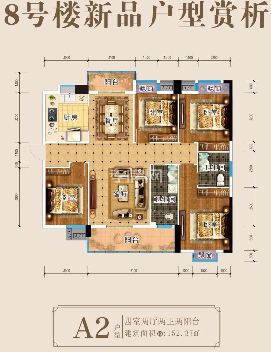 8#樓A2戶型:建面約152㎡ 四室兩廳兩衛(wèi)兩陽臺