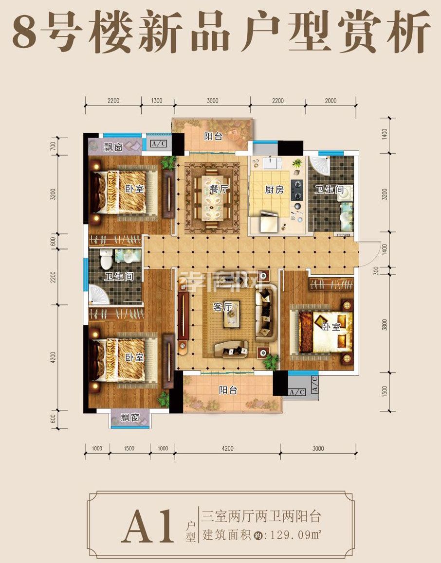 8#樓A1戶型:建面約129㎡ 三室兩廳兩衛(wèi)兩陽臺