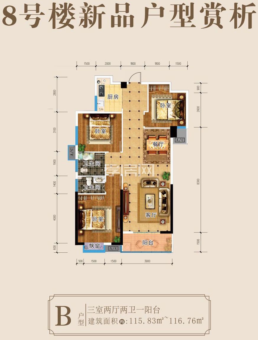 8#樓B戶型:建面約115㎡ 三室兩廳兩衛(wèi)一陽臺