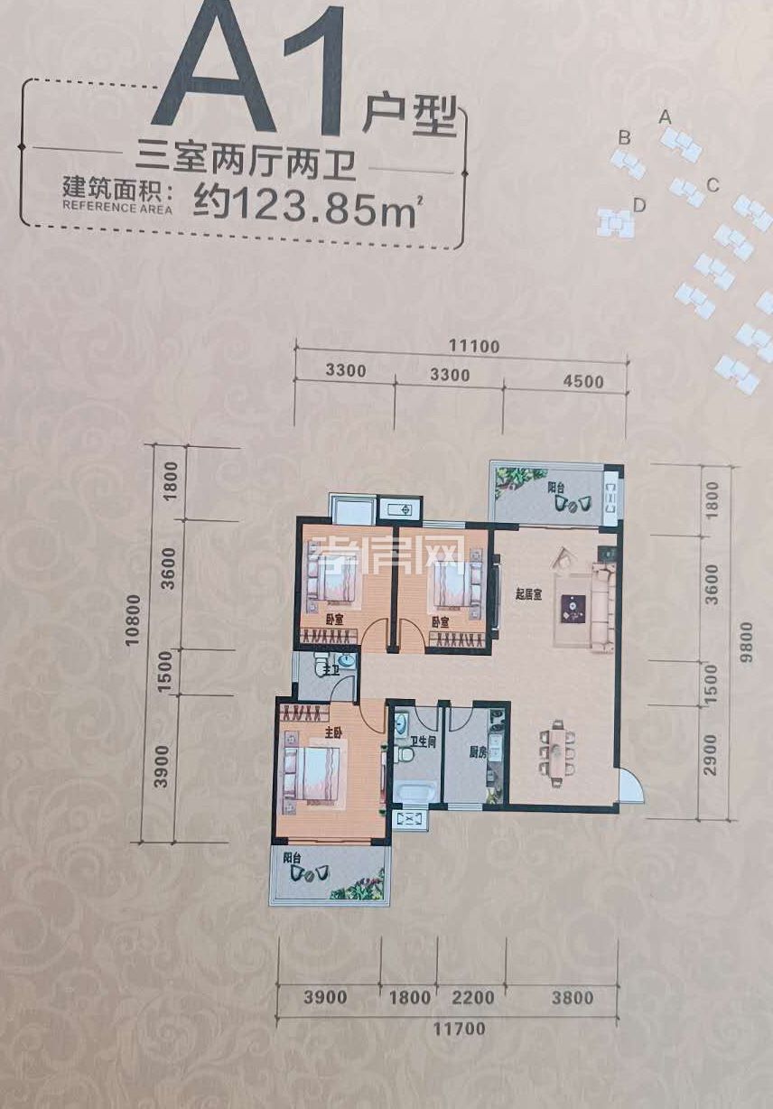 A1戶型:三室兩廳兩衛(wèi) 戶型面積約:123.85㎡