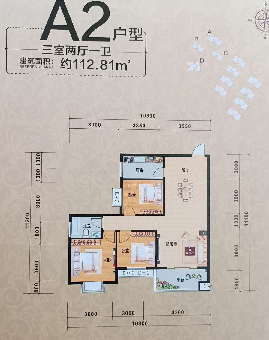 A2戶型:三室兩廳一衛(wèi) 戶型面積約:112.81㎡