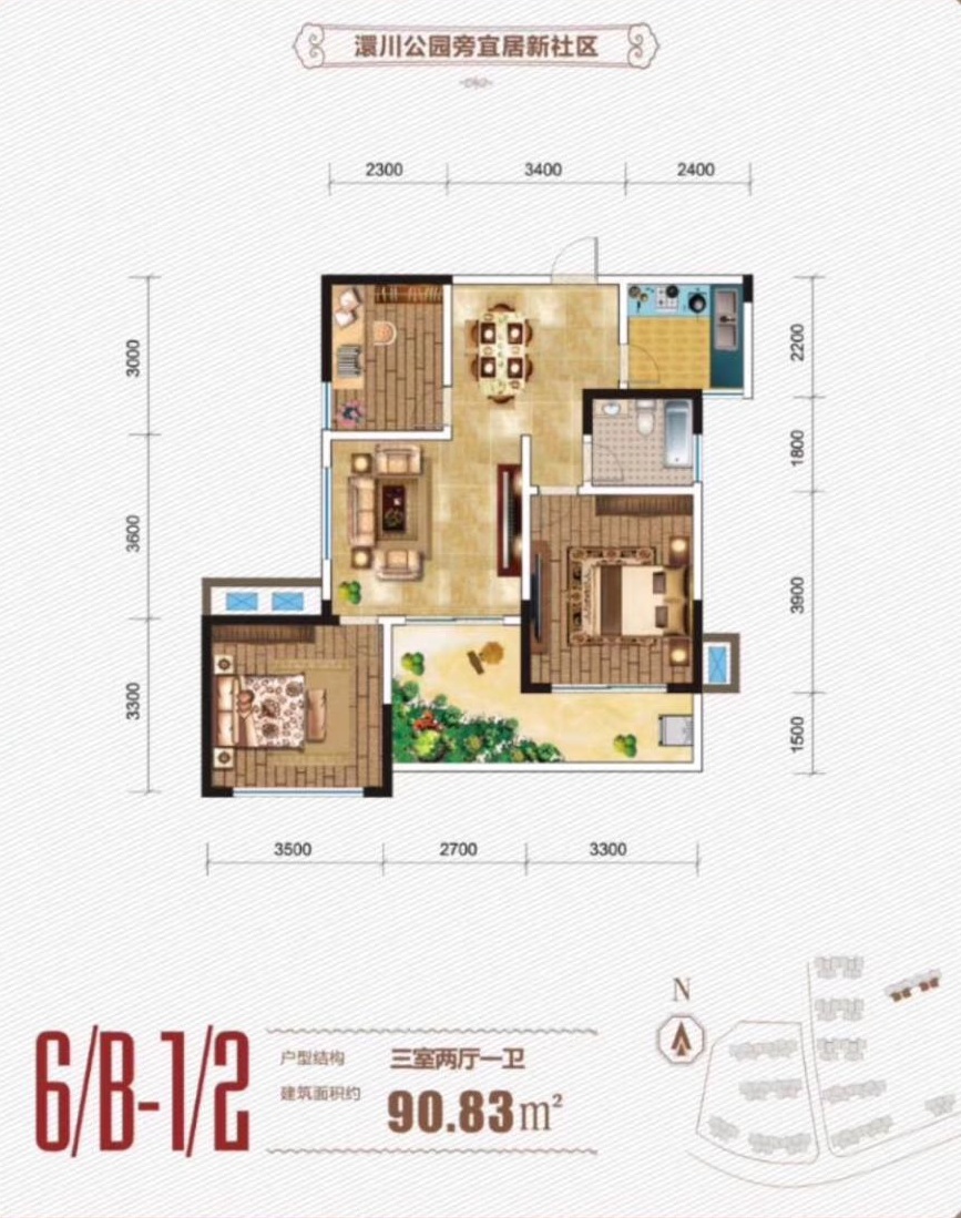 6/B-1/2:建面約90.83㎡ 三室兩廳一衛(wèi)戶型