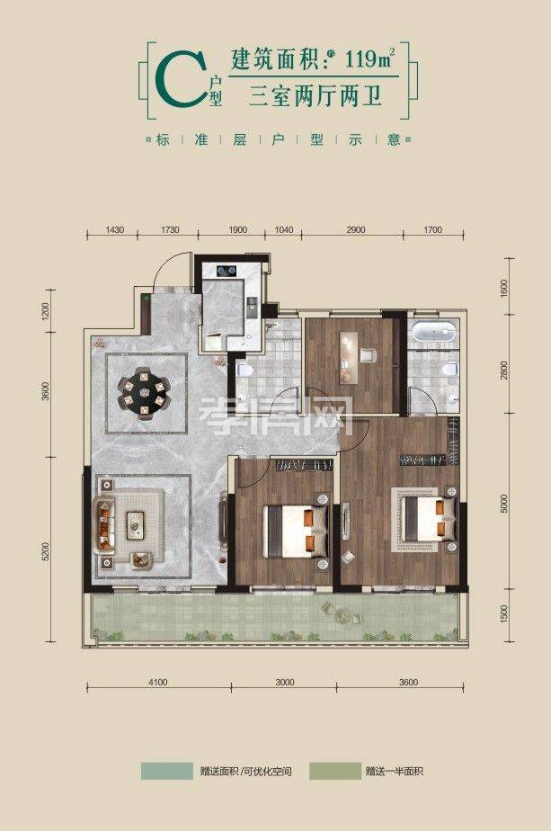 ? ? ? ?2、建面約119㎡三房?jī)蓮d兩衛(wèi)