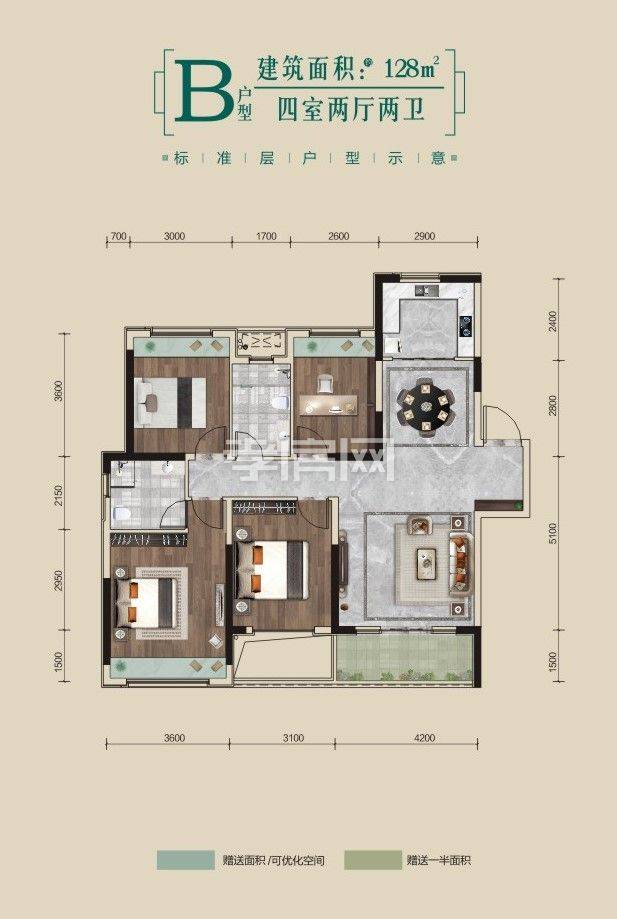 ? ? ? ?3、建面約128㎡四室兩廳兩衛(wèi)設(shè)計(jì)