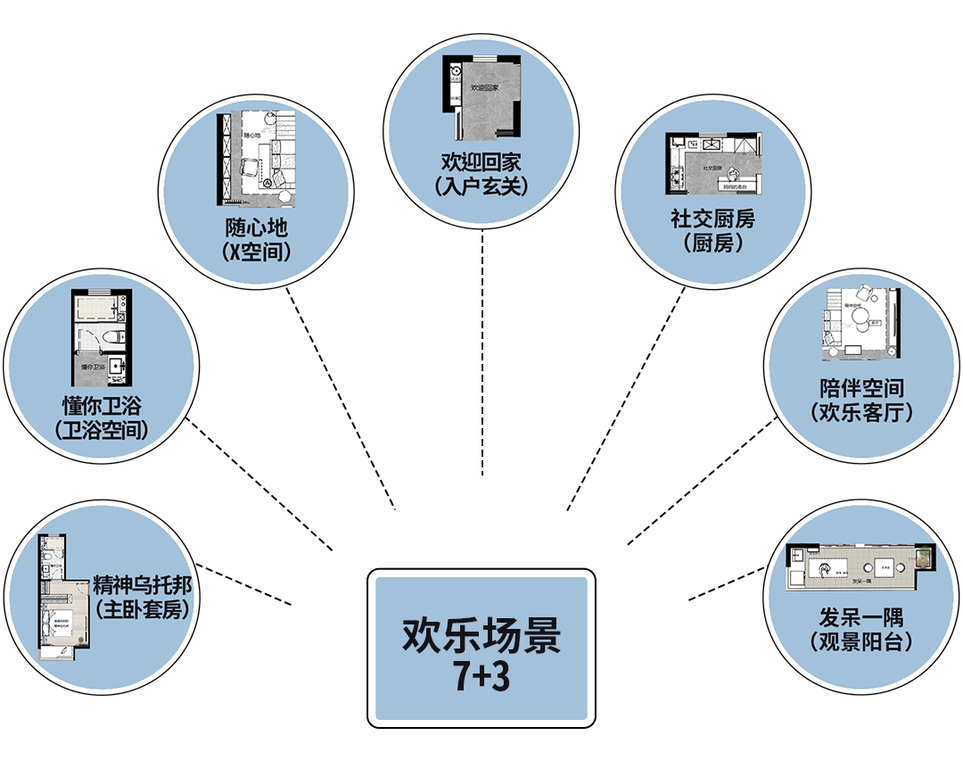 這種對于幸福與美好的向往,上海設計公司不斷深化20個幸福瞬間,提出包含7+3模塊的愛你歡樂家,旨在為居住者打造一處“充滿幸福瞬間的住宅”。
