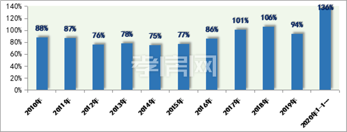 2010-2020年前10月全國(guó)商業(yè)銷(xiāo)售面積與竣工面積比值