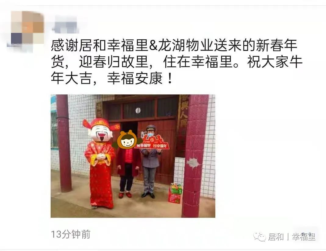 ? ? ? ?居和·幸福里與龍湖物業(yè)為業(yè)主們準(zhǔn)備了豐厚的大禮,挨家挨戶為業(yè)主送上新春年貨與新春祝福,為他們?cè)鎏硪荒剀?、喜慶的年味兒。