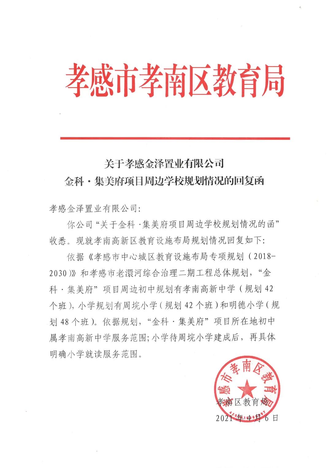 據(jù)教育局規(guī)劃,金科集美府附近即將規(guī)劃建造“孝南高新中學(xué)”,共計(jì)規(guī)劃42個(gè)班,同時(shí)小學(xué)規(guī)劃有“周垸小學(xué)”和“黃花明德小學(xué)”,待周垸小學(xué)完工后即可明確就讀范圍;