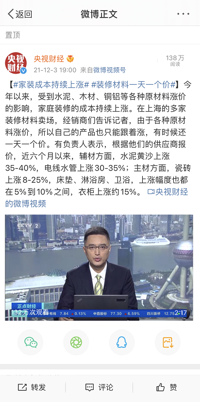 ? ? ? ?今年以來,受到水泥、木材、銅鋁等各種原材料漲價的影響,家庭裝修的成本持續(xù)上漲。