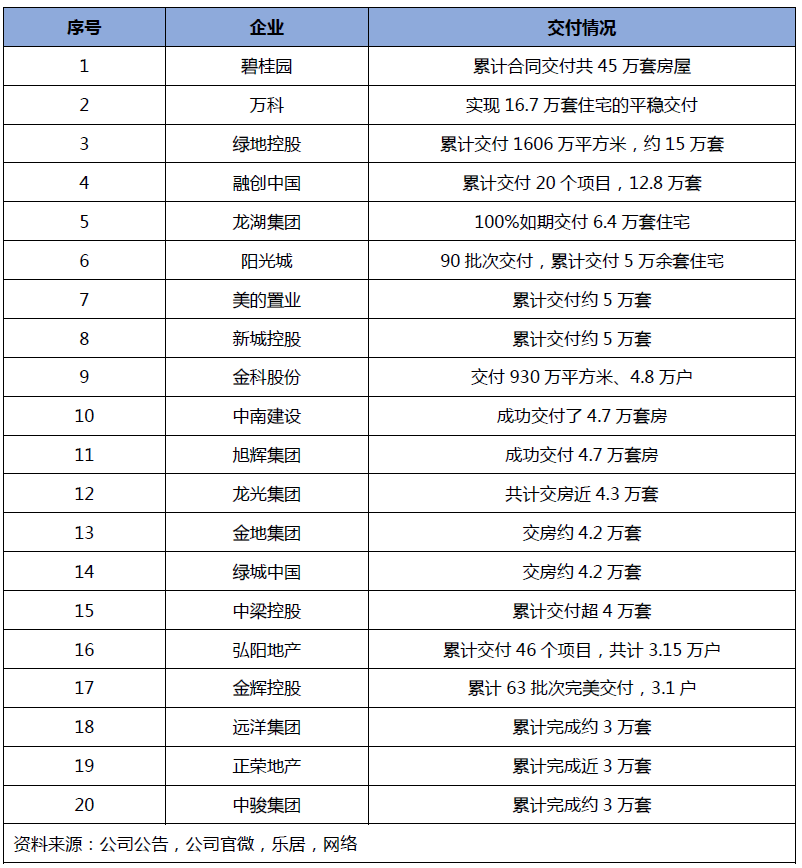 ? ? ? ?據(jù)樂居財經(jīng)研究院統(tǒng)計,2022年前三季度,已公示交付套數(shù)的35家房企累計交付房屋總數(shù)約147萬套,涉及1300多個樓盤。其中,碧桂園、萬科、綠地、融創(chuàng)、龍湖分別以45萬套、16.7萬套、15萬套、12.8萬套、6.4萬套的巨大交付量穩(wěn)居前五,占交付總量的65%以上。