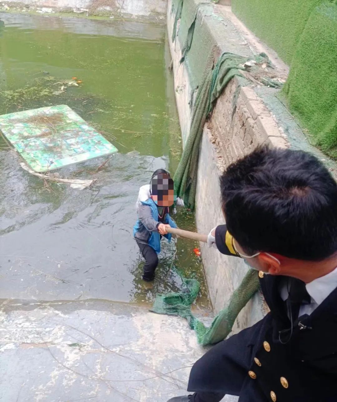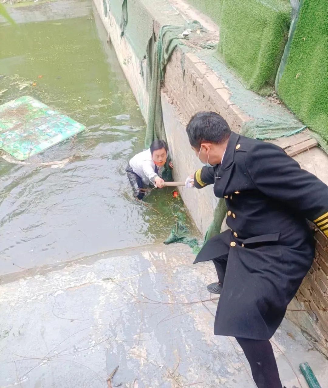 ? ? ? ?4月5日,孝感的天氣依舊寒冷。下午17:18,路邊突然傳來一聲驚呼:“這里有小朋友落水啦,快救人!”在聽見呼救聲后,項目秩序主管李亮、朱群,一個箭步?jīng)_出去,便看見一名大概11歲左右的小男孩,在水中拼命掙扎。見此情形,李亮毫不猶豫跳入水中,勇救落水男童。
