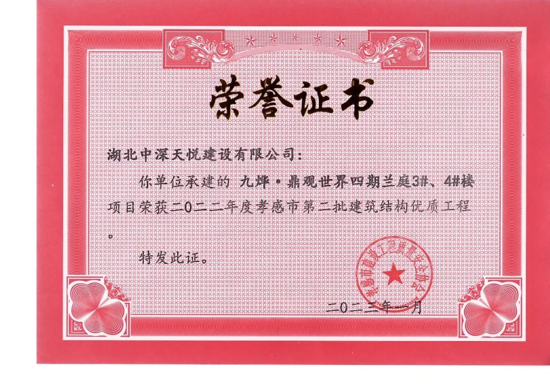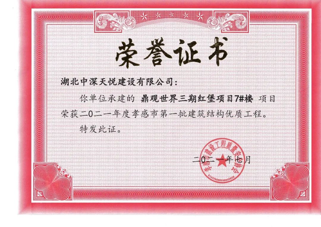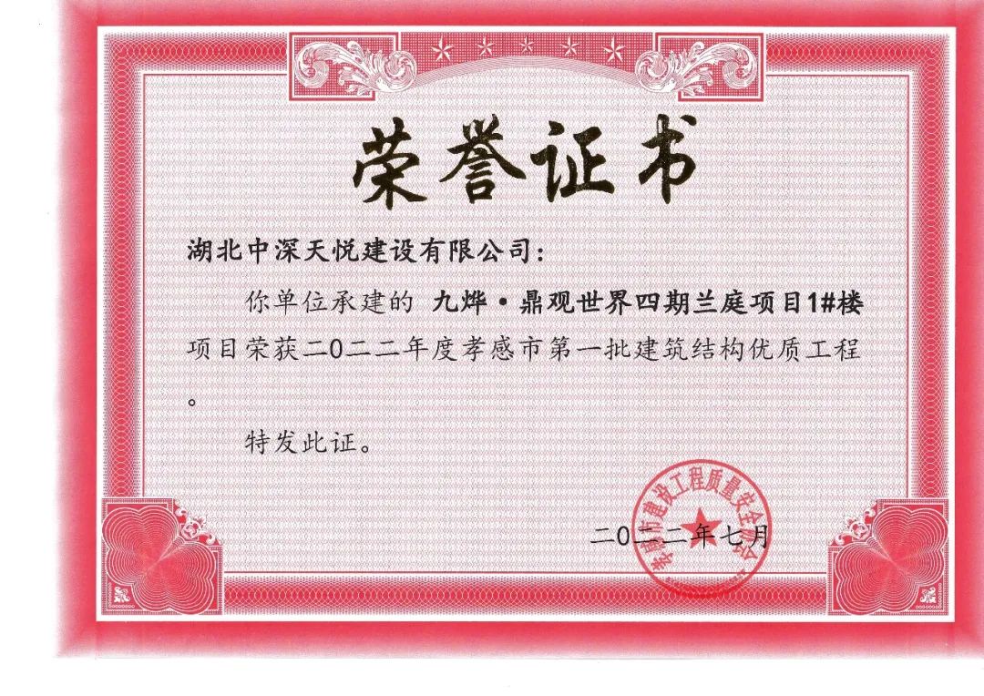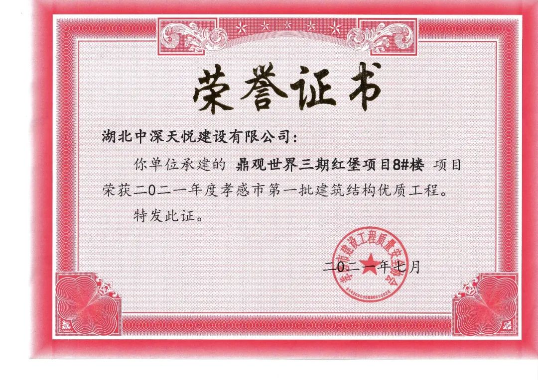 ? ? ? ? 心存高遠(yuǎn)的理想,不僅要踏實(shí)的走好每一步,更需要刻苦鉆研的的學(xué)習(xí),才能篤定的走向更高的目標(biāo)。三期紅堡6-10#樓被市住建局評(píng)為安全文明施工工地和結(jié)構(gòu)優(yōu)質(zhì)工程,正在申報(bào)“孝天杯”,隨著三期紅堡交付,目前正在申報(bào)房地產(chǎn)行業(yè)最高獎(jiǎng)項(xiàng)“廣廈獎(jiǎng)”。四期蘭庭項(xiàng)目榮獲孝感市中心城區(qū)文明施工“十佳”建筑工地榮譽(yù)稱(chēng)號(hào),1#3#4#樓還獲得了孝感市“建筑工程結(jié)構(gòu)優(yōu)質(zhì)”獎(jiǎng),為評(píng)選“孝天杯”奠定了基礎(chǔ)。