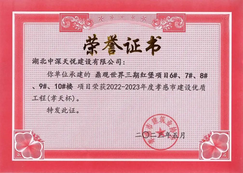 ? ? ? ?不斷加冕專業(yè)獎項,側(cè)寫美好生活畫卷。近日,由九燁集團湖北中深天悅建設(shè)有限公司承建的九燁·鼎觀世界三期紅堡項目6#、7#、8#、9#、10#樓榮獲“2022-2023年度孝感市建設(shè)優(yōu)質(zhì)工程(孝天杯)獎”?!靶⑻毂卑üこ藤|(zhì)量安全文明施工兩個獎項,是孝感市建筑行業(yè)工程質(zhì)量安全的最高榮譽獎。