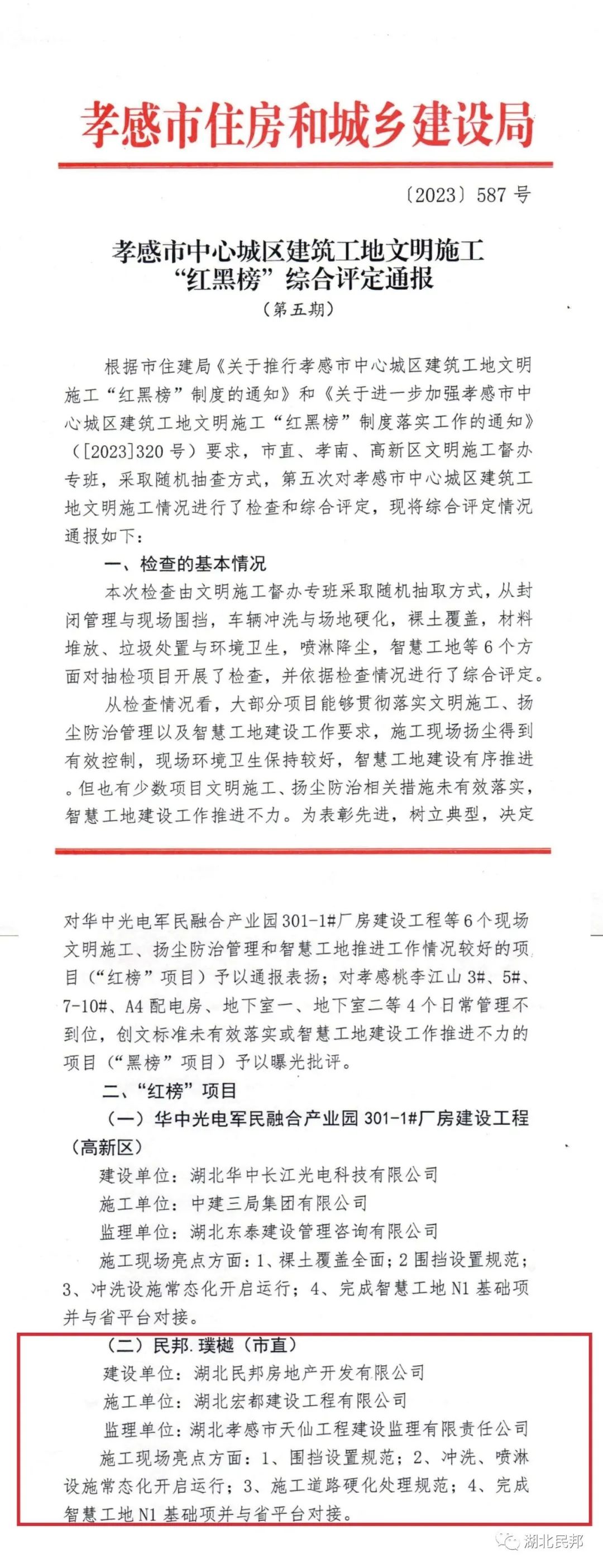 ? ? ? ?近日,從孝感市住建局傳來喜訊:民邦·璞樾項目在孝感市中心城區(qū)市直建筑工地文明施工綜合評定中,榮登紅榜,也是市直唯一一個紅榜單位,獲得市住建局的通報表揚。