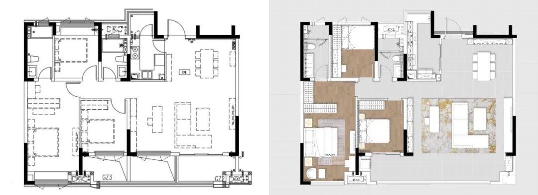 △? ?原始戶型平面(圖左)及定制戶型平面(圖右)