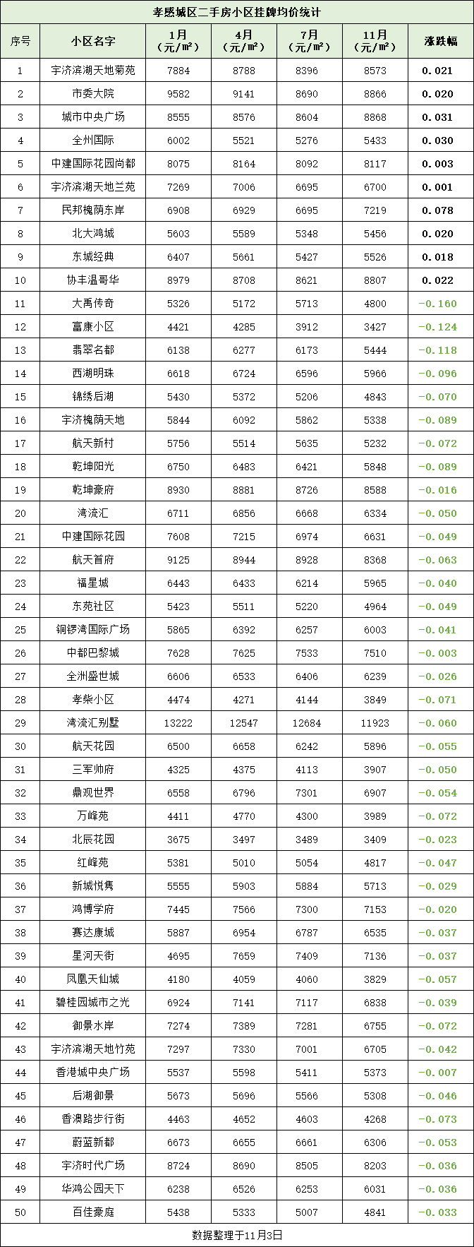 孝感50個(gè)小區(qū)掛牌價(jià)漲跌幅