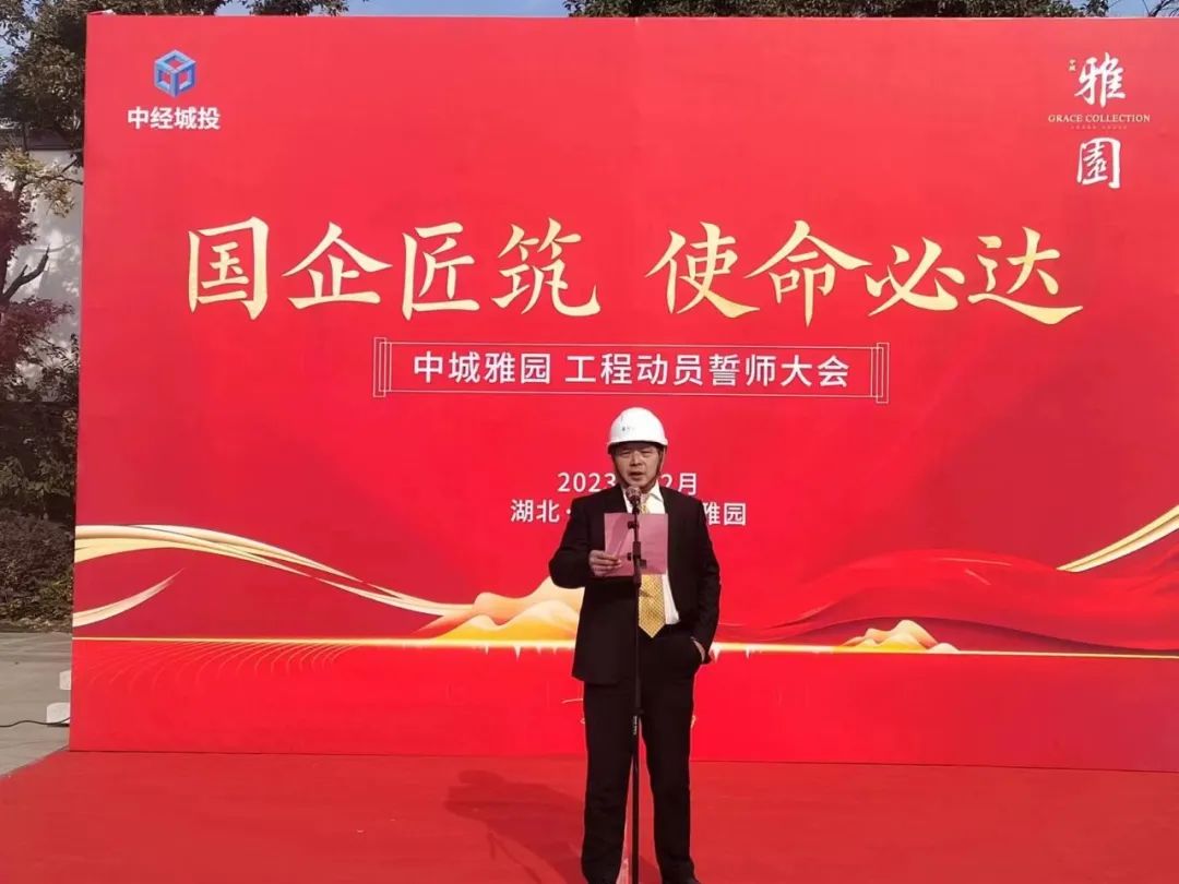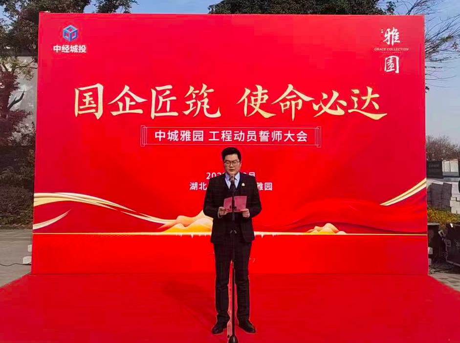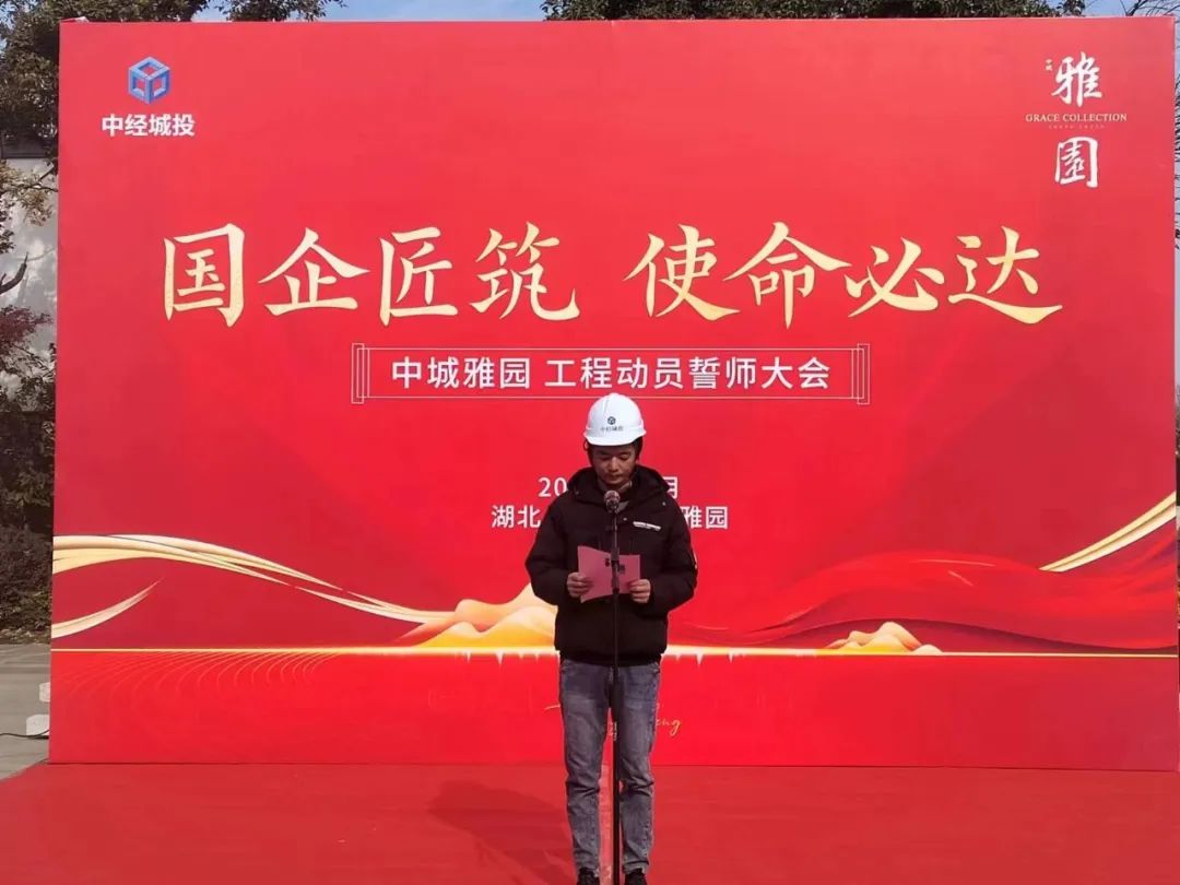 ? ? ? ?在誓師大會上,中經(jīng)城投王總經(jīng)理在致辭中首先簡短介紹了中經(jīng)城投作為國務(wù)院商務(wù)部全資控股企業(yè)的背景。強(qiáng)調(diào)中城雅園作為中經(jīng)城投在孝感的重點項目,將一如既往的大力支持,全力推進(jìn)工程項目建設(shè),確保按照既定節(jié)點高品質(zhì)交付。同時表示,A區(qū)工程將全面完工,大家要繼續(xù)發(fā)揚(yáng)匠心精神。保持高昂的斗志,嚴(yán)格按照集團(tuán)品質(zhì)要求,迎接即將2期工程的施工。