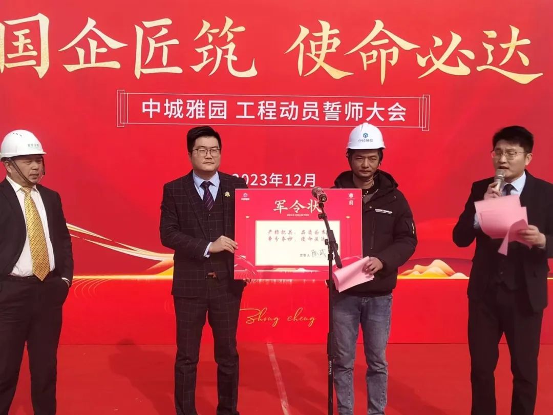 ? ? ? ?12月3日上午,中城雅園工程誓師大會在營銷中心前廣場隆重舉行。中經(jīng)城投領(lǐng)導(dǎo)、工程項目負(fù)責(zé)人、施工單位等代表共同出席本次活動。