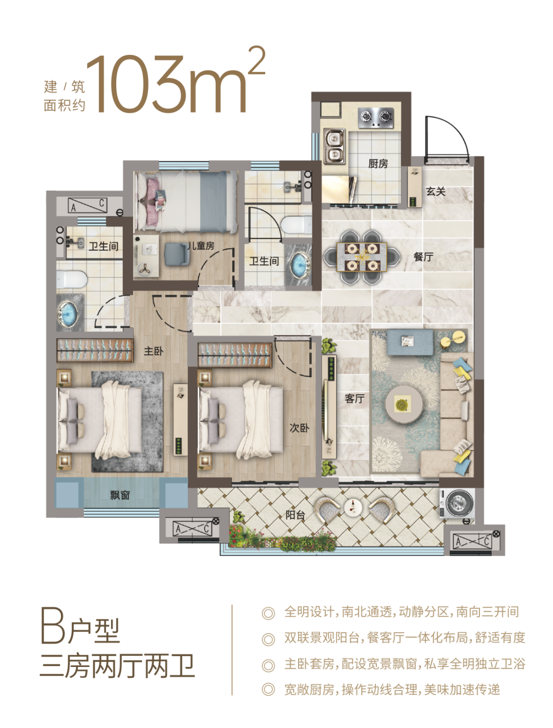 ? ? ? ?南向開間客廳和次臥,與瞰景陽臺一線連接,拓展室內(nèi)空間,與陽光清風(fēng)相擁。