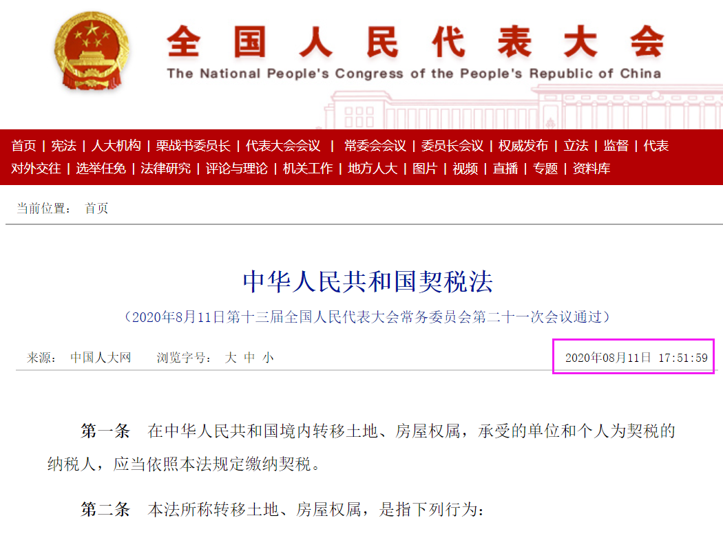 中華人民共和國(guó)契稅法(2020年8月11日第十三屆全國(guó)人民代表大會(huì)常務(wù)委員會(huì)第二十一次會(huì)議通過(guò))