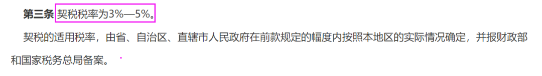 (2)本次《契稅法》第三條寫(xiě)明:契稅稅率為百分之三至百分之五。
