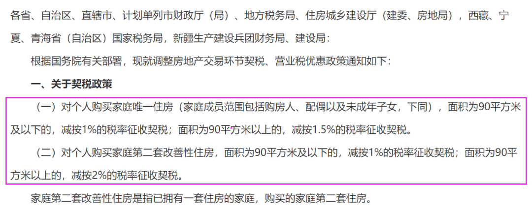 ①對(duì)個(gè)人購(gòu)買(mǎi)家庭唯一住房(家庭成員范圍包括購(gòu)房人、配偶以及未成年子女,下同),面積為90平方米及以下的,減按1%的稅率征收契稅;面積為90平方米以上的,減按1.5%的稅率征收契稅。