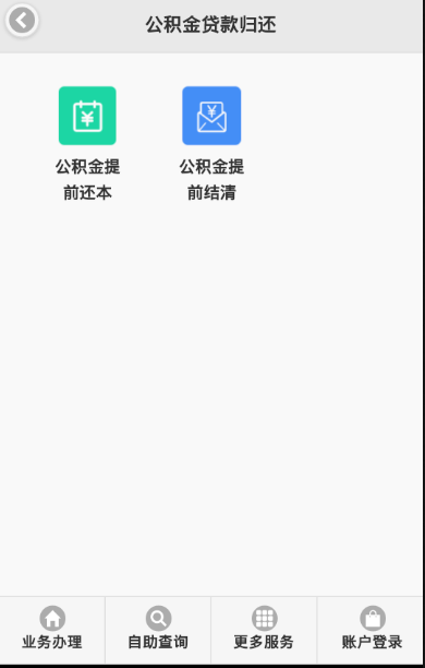 1、點(diǎn)擊“貸款業(yè)務(wù)”中的“公積金還貸”欄目,頁面顯示2個(gè)子菜單,包括公積金提前還本、提前結(jié)清。