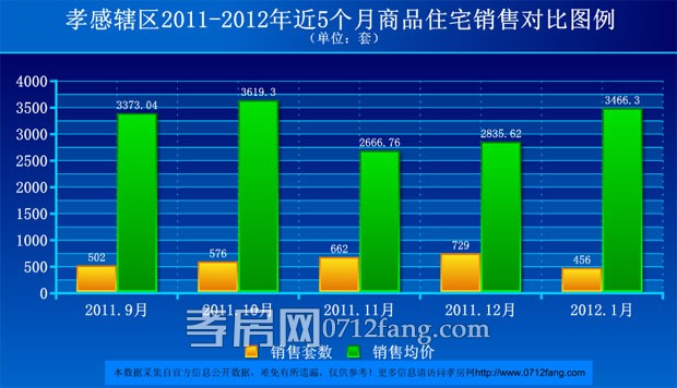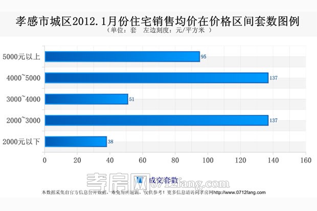 據(jù)孝房網(wǎng)研究的統(tǒng)計數(shù)據(jù)顯示,2012年1月(1月1日-1月31日)孝感市城區(qū)(注:本篇城區(qū)為孝南城區(qū),開發(fā)東區(qū),開發(fā)西區(qū),孝南鄉(xiāng)鎮(zhèn)統(tǒng)稱)商品房共成交469套,銷售總面積47773.81平米,銷售總金額173148496.06元,銷售均價3624.34元/平米; 其中商品住宅成交456套,成交金額163435827.86元,銷售面積47149.96平米,均價3466.3元/平米;非住宅銷售面積623.85平米,均價15568.92元/平米,銷售13套,銷售總金額9712668.2元。