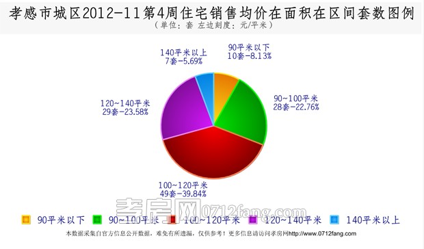 2012年11月4周(11月19日-11月25日)據(jù)孝房網(wǎng)研究的統(tǒng)計數(shù)據(jù)顯示,孝感城區(qū)商品房共銷售187套,銷售面積21459.85平米,銷售總金額105431895.54元,銷售均價4912.98元/平米。其中住宅銷售為123套,銷售面積13833.24平米,銷售均價3593.23元/平米。非住宅銷售為64套,銷售均價7306.76元/平米。