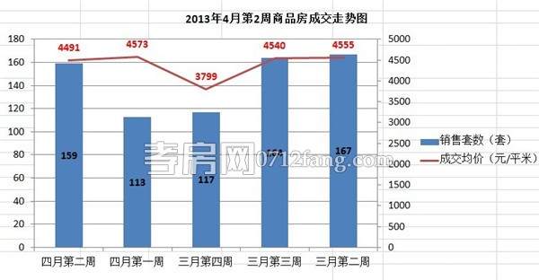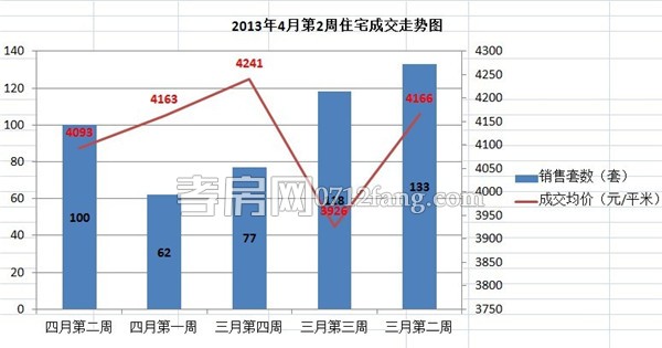 2013年4月2周(2013-04-08日到2013-04-14日)孝感城區(qū)商品房總銷售159套,成交面積17583平方米, 成交均價4491元/平米。 其中住宅銷售100套,銷售面積11393平方米,均價 4093元/平米;非住宅銷售59套,銷售面積6190平方米,均價5223元/平米。