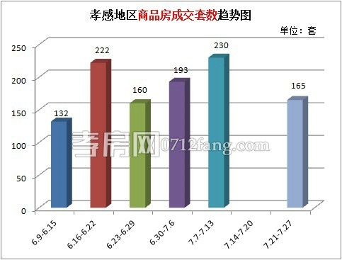 據(jù)數(shù)控顯示,從2014年7月21日到2014年7月27日,孝感地區(qū)銷售總交易記錄165套,面積為16025.76平方米,金額為63907246.54元,均價為3987.783元/平方米。